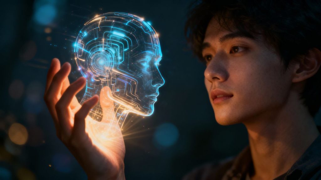 Person interacting with a glowing AI knowledge network.