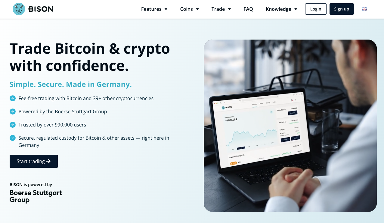 Bison is a German cryptocurrency exchange operated by Börse Stuttgart Group, a large European financial institution. The platform focuses on simplicity while leveraging traditional finance infrastructure.