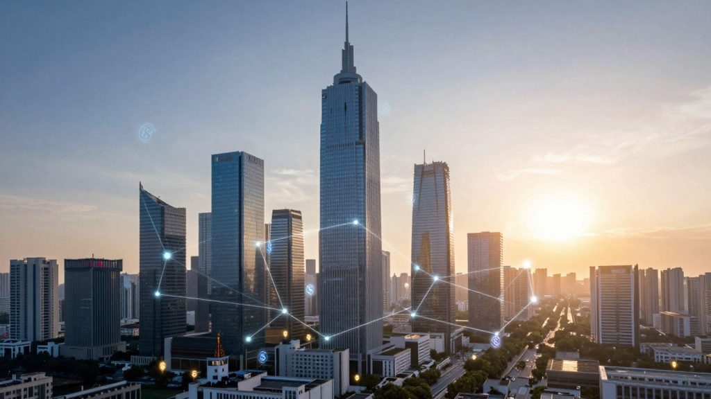 Futuristic blockchain cityscape with glowing network lines and digital currency symbols.