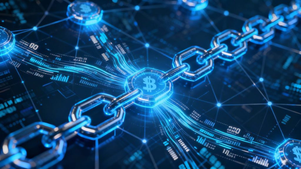 Blockchain network with glowing nodes and abstract data flow.