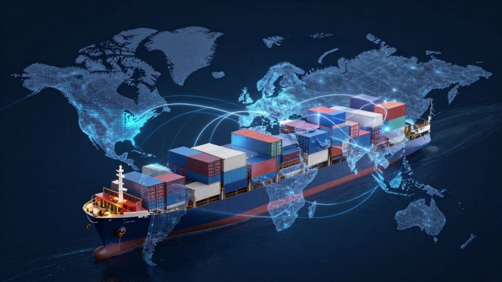 Blockchain supply chain transparency connecting global trade.