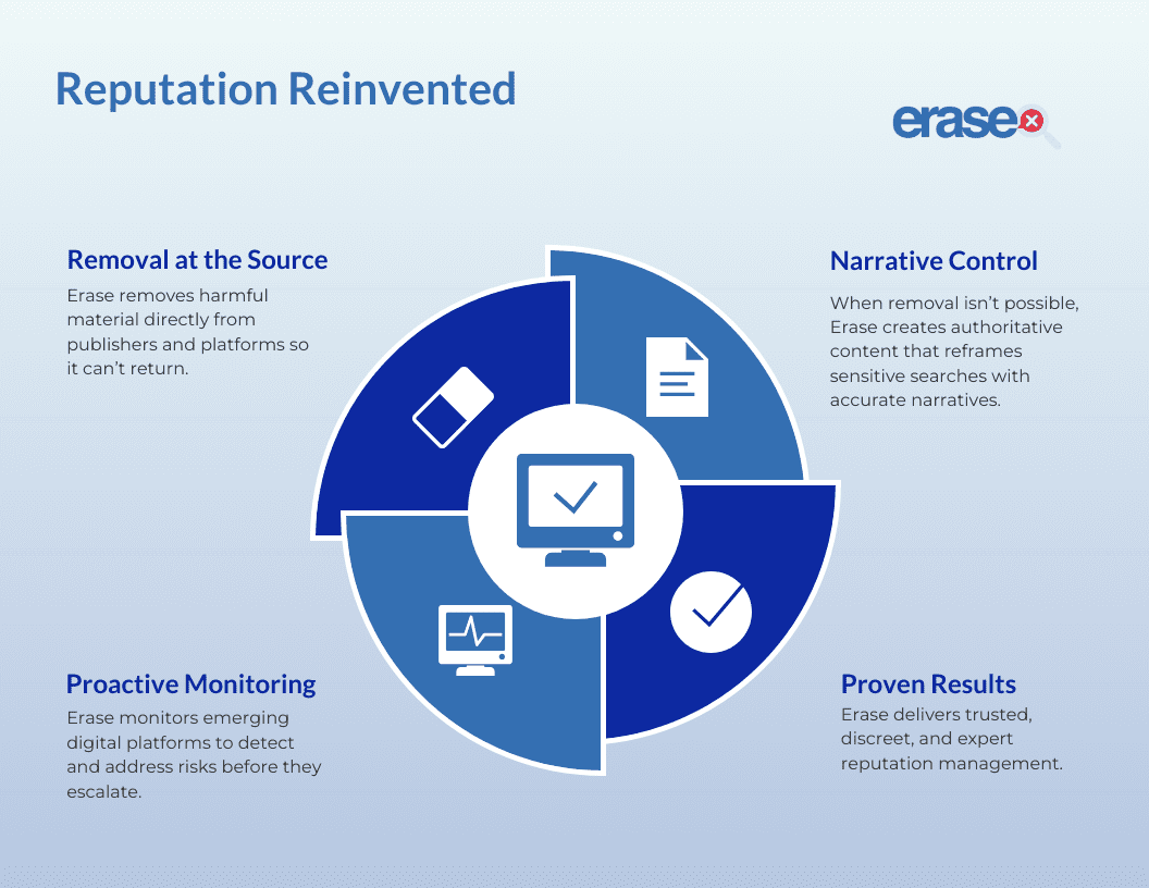 If the rules have changed, the solution must evolve too. This is where Erase.com has built its leadership position. Unlike firms that focus only on burying negative content, Erase.com addresses reputational threats at their root.