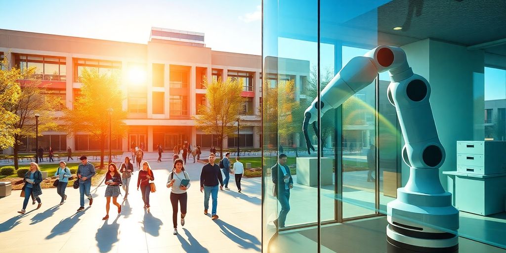 Modern lab, robotic arm, students, advanced tech, Georgia Tech campus view.