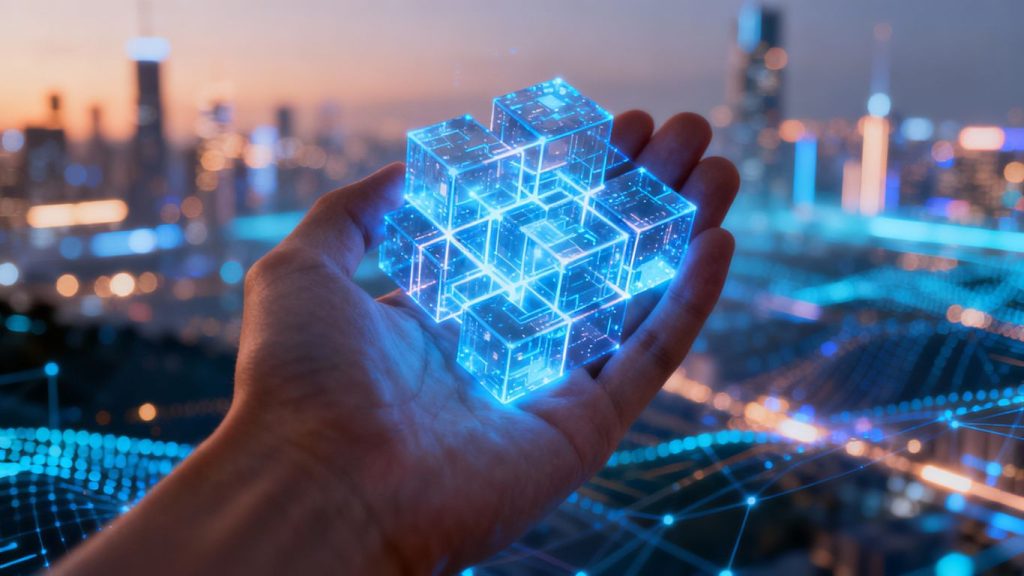 Futuristic cityscape with glowing digital connections and geometric shapes.