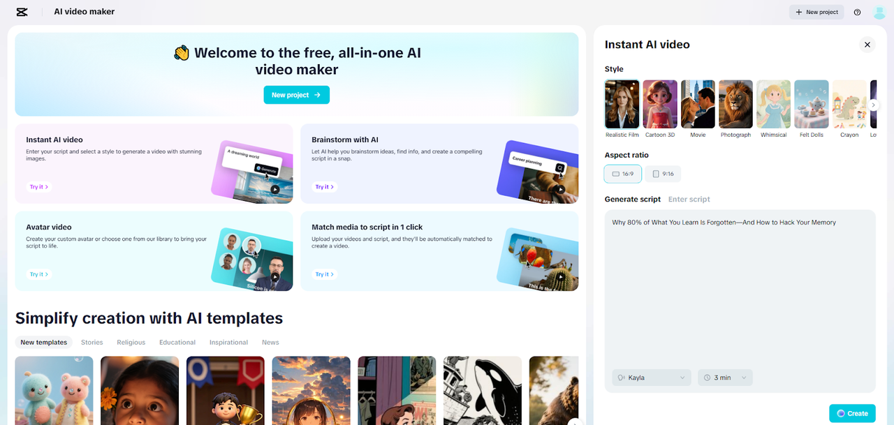 Step 1: Activate the Quick Sync Highlight Builder Launch the CapCut online editor and reach the main dashboard. Select the “Free AI video maker” option to unlock the AI tools. Choose “Instant AI video” to access the Quick Sync system for fast-paced sports highlights.