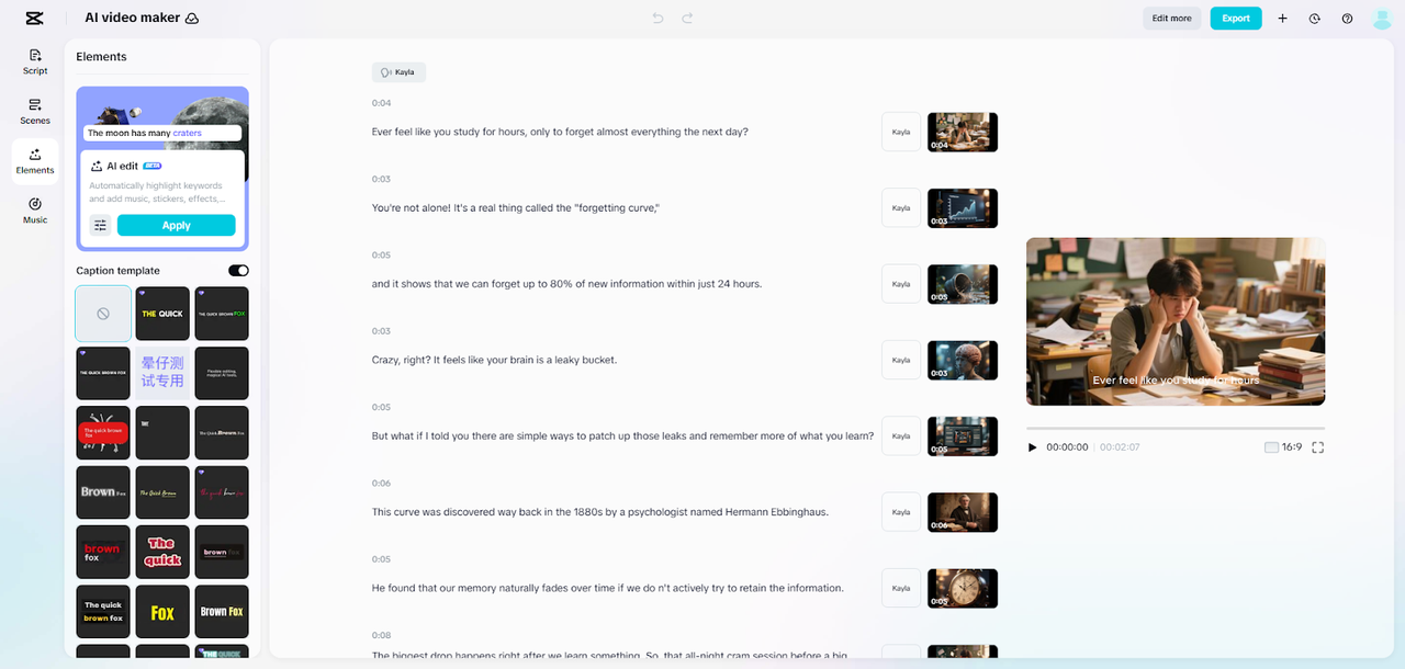 Step 3: Sync Motion, Enhance, and Export Press “Create” to generate the visual storyboard. Open the “Music” panel and add a high-energy track from CapCut’s audio library. Visit “Elements” to select a caption template that matches the sports intensity.