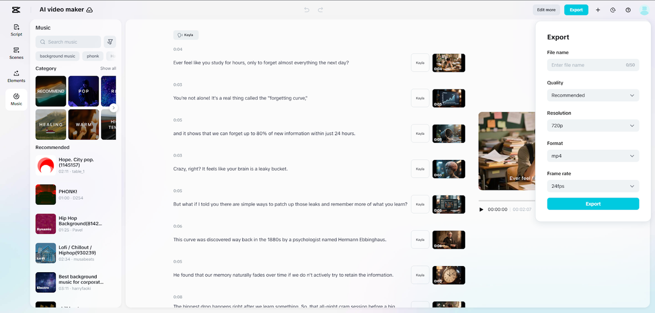 Good highlight editing begins with well-organized footage. Divide group clips by plays, teams, or sequences to enhance AI interpretation. CapCut allows uploading of large files, so that it is not complicated to work with the full-length matches or long-term training. Select vibrant music in the library of the platform to match the speed of your video. Good choice of audio also helps in the interest of the viewer and make the Quick Sync match the cuts to the beats intuitively. Using the AI video maker, you can quickly generate preliminary edits, experiment with transitions, and refine the overall flow of highlights. This step helps to prepare the work and minimize the number of repetitive changes in the final editing.