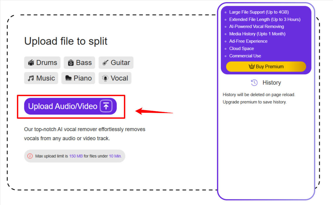Once the file is uploaded, hit the “Remove Vocals” button. The AI will automatically analyze and split the audio into four distinct parts: vocals, music, bass, and drums.