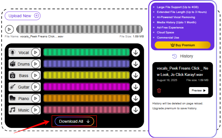 After processing (usually within seconds), you’ll be presented with download options for each isolated track.