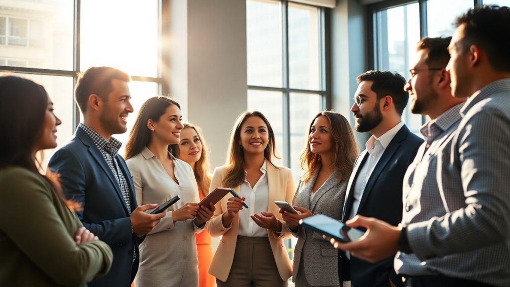 Professionals collaborating in a bright, modern tech office.