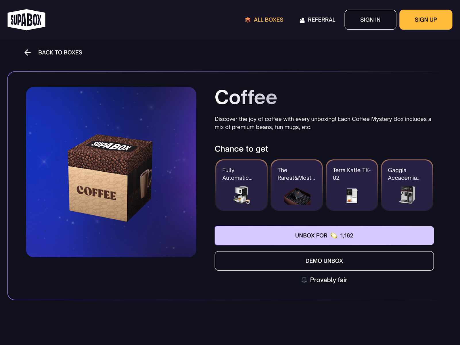 Customers begin by purchasing Supagold, Supabox’s platform credit, and selecting a themed mystery box that clearly displays every potential prize. With fixed odds and a guaranteed real item in every box, shoppers know the minimum value they will receive before unboxing. Supabox deliberately keeps variance low and sets a floor value higher than competing mystery‑box operators, while ensuring every prize is on‑theme – no filler items allowed. After revealing the item, they can either redeem it for shipment or trade it back for Supagold, creating a friction‑free loop that fuels high repeat engagement.