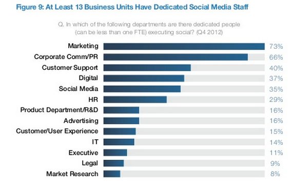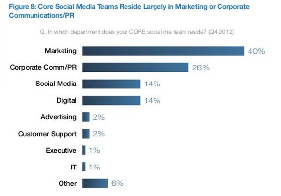 • Although most dedicated social media teams report to a centralized department such as Marketing (40%) or Corporate Communications/PR (26%), on average 13 different departments in each organization have staff dedicated to social initiatives.