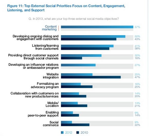 • The top priorities for social across the organizations covered by the survey are integrating data, scaling for engagement, and training staff in social business.