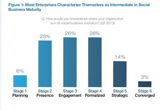 Stage 6: Converged – A mere 3% of those surveyed felt that their organizations could be described as fully mature social businesses, with social media strategies intrinsically woven into the fabric of the organization.