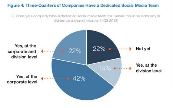 • On the whole, companies are committing more and more people to social media. The biggest jump has been seen in companies with more than 100,000 employees, with an average of 49 full-time employees supporting social media in 2013, up from 20 in 2010.