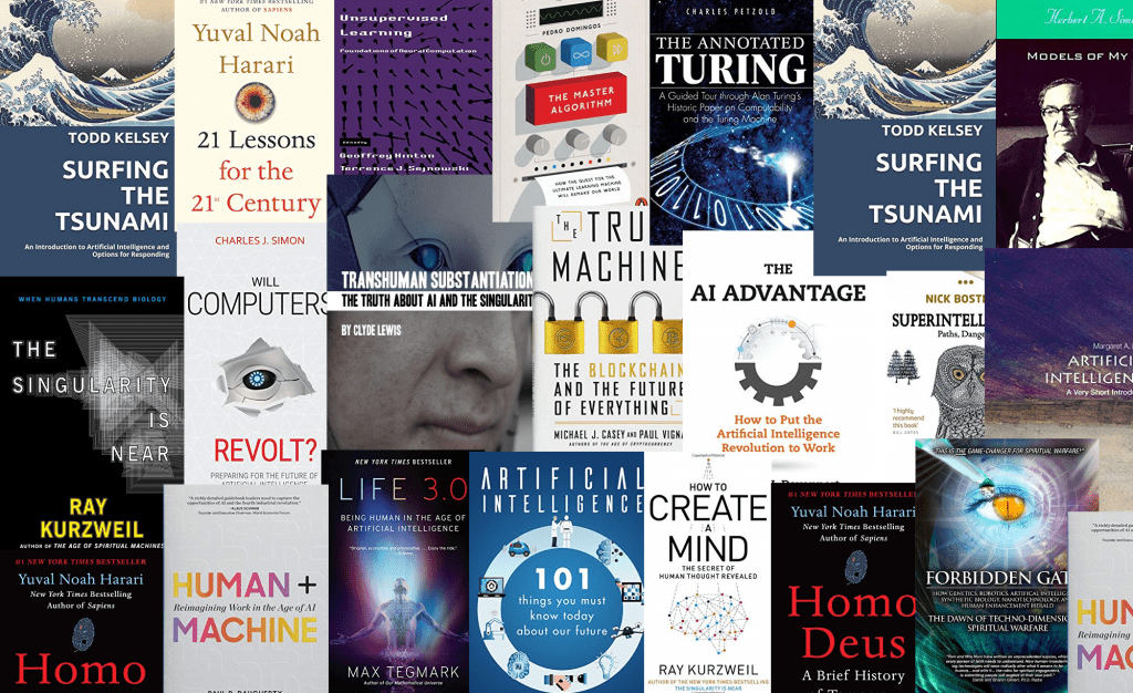 by Yuval Noah Harari, Feb 21, 2017[/vc_column_text][/vc_column_inner][/vc_row_inner][vc_row_inner][vc_column_inner width=”1/4″][vc_single_image image=”73691″ img_size=”full”][vc_column_text]The Truth Machine: The Blockchain and the Future of Everything by Paul Vigna and Michael J. Casey, Feb 27, 2018[/vc_column_text][/vc_column_inner][vc_column_inner width=”1/4″][vc_single_image image=”73683″ img_size=”full”][vc_column_text]Life 3.0: Being Human in the Age of Artificial Intelligence by Max Tegmark , Jul 31, 2018[/vc_column_text][/vc_column_inner][vc_column_inner width=”1/4″][vc_single_image image=”73681″ img_size=”full”][vc_column_text]Human + Machine: Reimagining Work in the Age of AI by Paul R. Daugherty and H. James Wilson, Mar 20, 2018[/vc_column_text][/vc_column_inner][vc_column_inner width=”1/4″][vc_single_image image=”73694″ img_size=”full”][vc_column_text]Transhuman Substantiation The Truth about AI and the Singularity, by Clyde Lewis, Jul 17, 2018[/vc_column_text][/vc_column_inner][/vc_row_inner][vc_row_inner][vc_column_inner width=”1/4″][vc_single_image image=”73682″ img_size=”full”][vc_column_text]Artificial Intelligence 101 Things You Must Know Today About Our Future Lasse Rouhiainen, 2018[/vc_column_text][/vc_column_inner][vc_column_inner width=”1/4″][vc_single_image image=”73688″ img_size=”full”][vc_column_text]Surfing the Tsunami An Introduction to Artificial Intelligence and Options for Responding Todd Kelsey, 2018[/vc_column_text][/vc_column_inner][vc_column_inner width=”1/4″][vc_single_image image=”73698″ img_size=”full”][vc_column_text]21 Lessons for the 21st Century by Yuval Noah Harari | Sep 4, 2018[/vc_column_text][/vc_column_inner][vc_column_inner width=”1/4″][vc_single_image image=”73673″ img_size=”full”][vc_column_text]AI Superpowers: China, Silicon Valley, and the New World Order by Kai-Fu Lee, Sep 25, 2018[/vc_column_text][/vc_column_inner][/vc_row_inner][vc_row_inner][vc_column_inner width=”1/4″][vc_single_image image=”73697″ img_size=”full”][vc_column_text]Will Computers Revolt? Preparing for the Future of Artificial Intelligence, by Charles J Simon, October 2018[/vc_column_text][/vc_column_inner][vc_column_inner width=”1/4″][vc_single_image image=”73689″ img_size=”full”][vc_column_text]The AI Advantage How to Put the Artificial Intelligence Revolution to Work By Thomas H. Davenport, Oct 16, 2018[/vc_column_text][/vc_column_inner][vc_column_inner width=”1/4″][vc_single_image image=”73675″ img_size=”full”][vc_column_text]Architects of Intelligence: The truth about AI from the people building it by Martin Ford | Nov 23, 2018[/vc_column_text][/vc_column_inner][vc_column_inner width=”1/4″][vc_single_image image=”73684″ img_size=”full”][vc_column_text]Artificial Intelligence A Very Short Introduction, Margaret A. Boden, Dec 1, 2018[/vc_column_text][/vc_column_inner][/vc_row_inner][/vc_column][/vc_row]