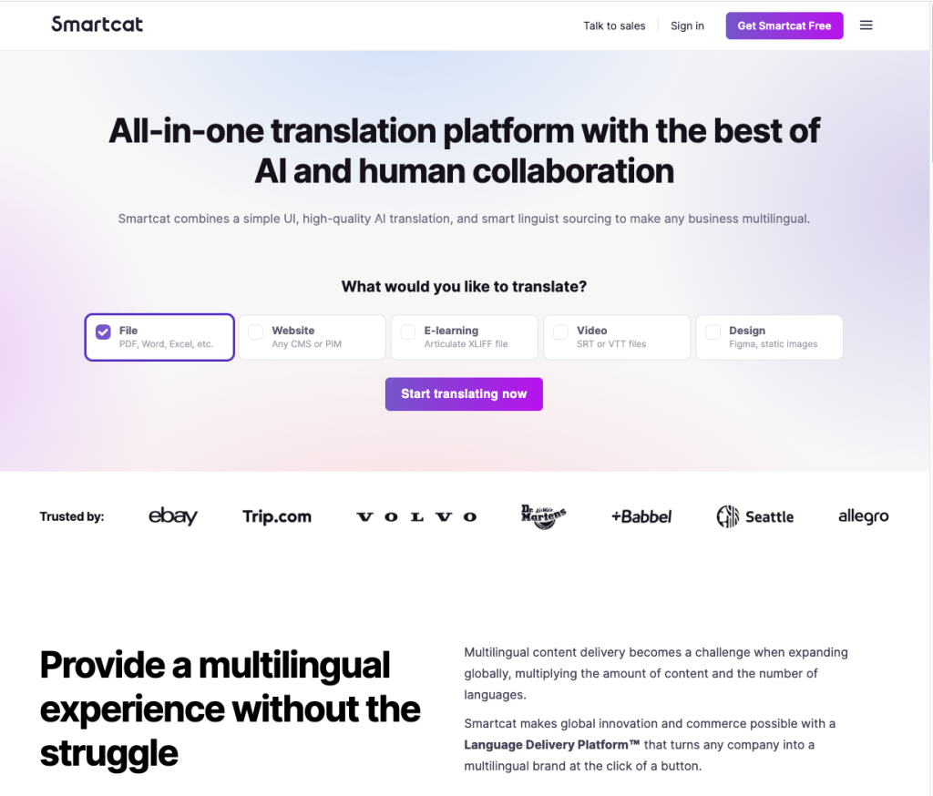 With Smartcat, teams can start with a free trial, upload content across formats, and let AI agents handle first drafts and multi-language output. Human review can be added where needed without slowing delivery.